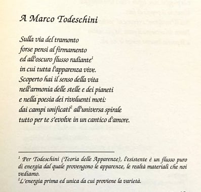 Durante il nostro dialogo, che durò circa due o tre ore, Todeschini si aprì completamente, esternandomi anche delle confidenze come la lettura della mano da parte di una zingara che gli aveva profetizzato che la sua teoria sarebbe stata molto osteggiata ma alla fine avrebbe vinto. Il Nostro diede una certa enfasi a quell’evento perché la zingara non poteva sapere che fosse uno scienziato, tanto meno che fosse l’autore della Teoria per eccellenza. Mi chiedo ancora il perché questo gigante della conoscenza si era aperto a me con queste confidenze, e non so spiegarlo se non per il semplice particolare che all’epoca (avevo solo 21 anni) avevo una tale sete di conoscenza che Todeschini deve aver visto nei miei occhi, insieme a una purezza d’animo che deve averlo ingentilito nei miei confronti. Forse anche per via della lettera che avevo scritto un mese prima e che aveva toccato il suo cuore, tanto che mi battezzò nella sua risposta con queste parole: «Il Suo entusiasmo ed il Suo completo appagamento spirituale, filosofico e scientifico, così apertamente manifestatomi mi confermano che Ella è un acutissimo ingegno ed anche un animo di squisita bontà che anela il benessere umano». Sta di fatto che dopo l’incontro con lo scienziato bergamasco e dopo aver divorato i suoi capolavori mi convertii alla fisica, abbandonando il corso di studi di chimica-fisica teorica dell’Università di Torino per iscrivermi al corso di studi in Fisica dell’Università di Perugia. La mia amata chimica della quale avevo coltivato una febbrile passione da quando ero ancora un bambino venne sepolta dai nuovi studi in fisica, una passione ancora più grande verso i misteri dell’Universo. In fondo si trattava di passare dalla domanda “di cosa è fatto il Mondo” a quella di “come funziona il Mondo”, quali sono le sue leggi e la sua dinamica. Più tardi avrei fatto “l’ultimo salto”, quello di cavalcare gli innumerevoli “perché” che costellano l’esistente, "perché è proprio così e non diversamente", arrivando a bussare al portone di Platonopoli, così come veniva chiamata da Plotino la città ideale della Filosofia.